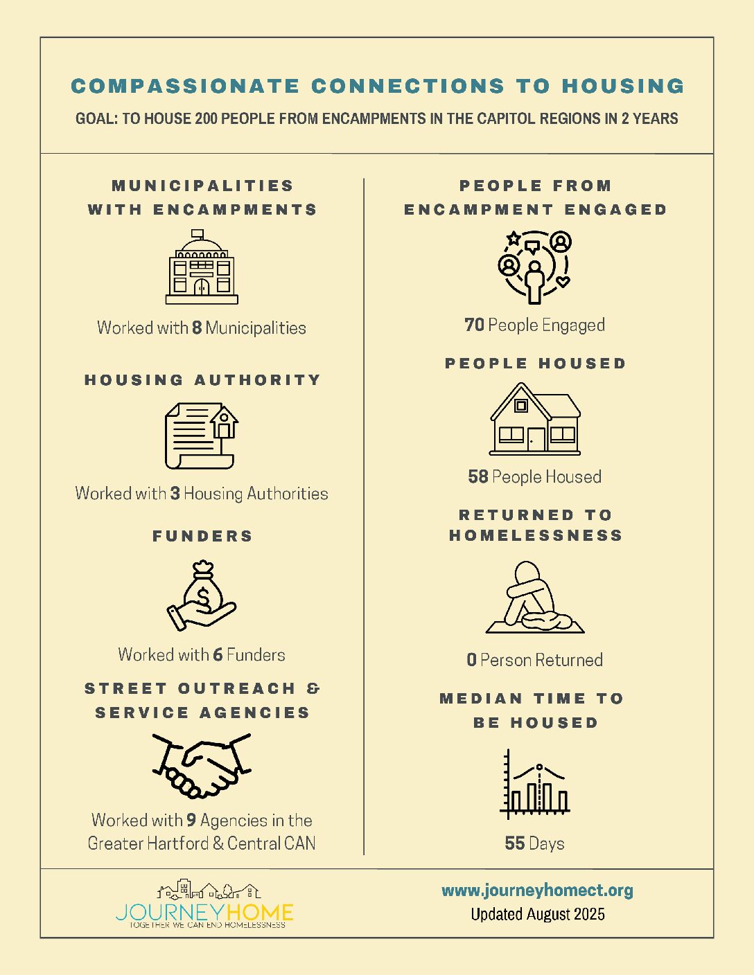 In July of 2024, Journey Home launched the Compassionate Connections to Housing Initiative with the goal of rehousing 200 unsheltered individuals over the next two years. Journey Home has implemented a new model for rapidly rehousing from homeless encampments that was established by Clutch Consulting, a national consulting firm. This model has shown success in other cities such as Houston, Oklahoma City, and New Orleans. Journey Home staff worked with Clutch Consulting in 2023 and 2024 we received technical assistance and training as we began to pilot the model in January 2024